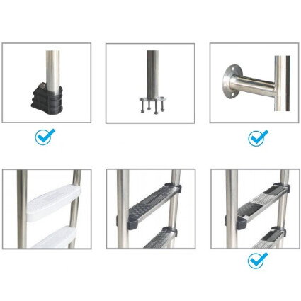 Лестница Aquaviva SP-415 предназначена для обеспечения удобного входа и выхода из плавательного бассейна. Состоит из 2-х частей. Поручни отдельно устанавливаются на горизонтальной верхней части бассейна с помощью закладных стаканов, которые закрываются накладками из нержавеющей стали. Сама лестница со ступеньками монтируется на стенку бассейна с помощью фланцев, а нижняя ее часть упирается в стенку резиновыми заглушками. Очень удобное решение для бассейнов с плавающими покрывалами и защитными жалюзи.